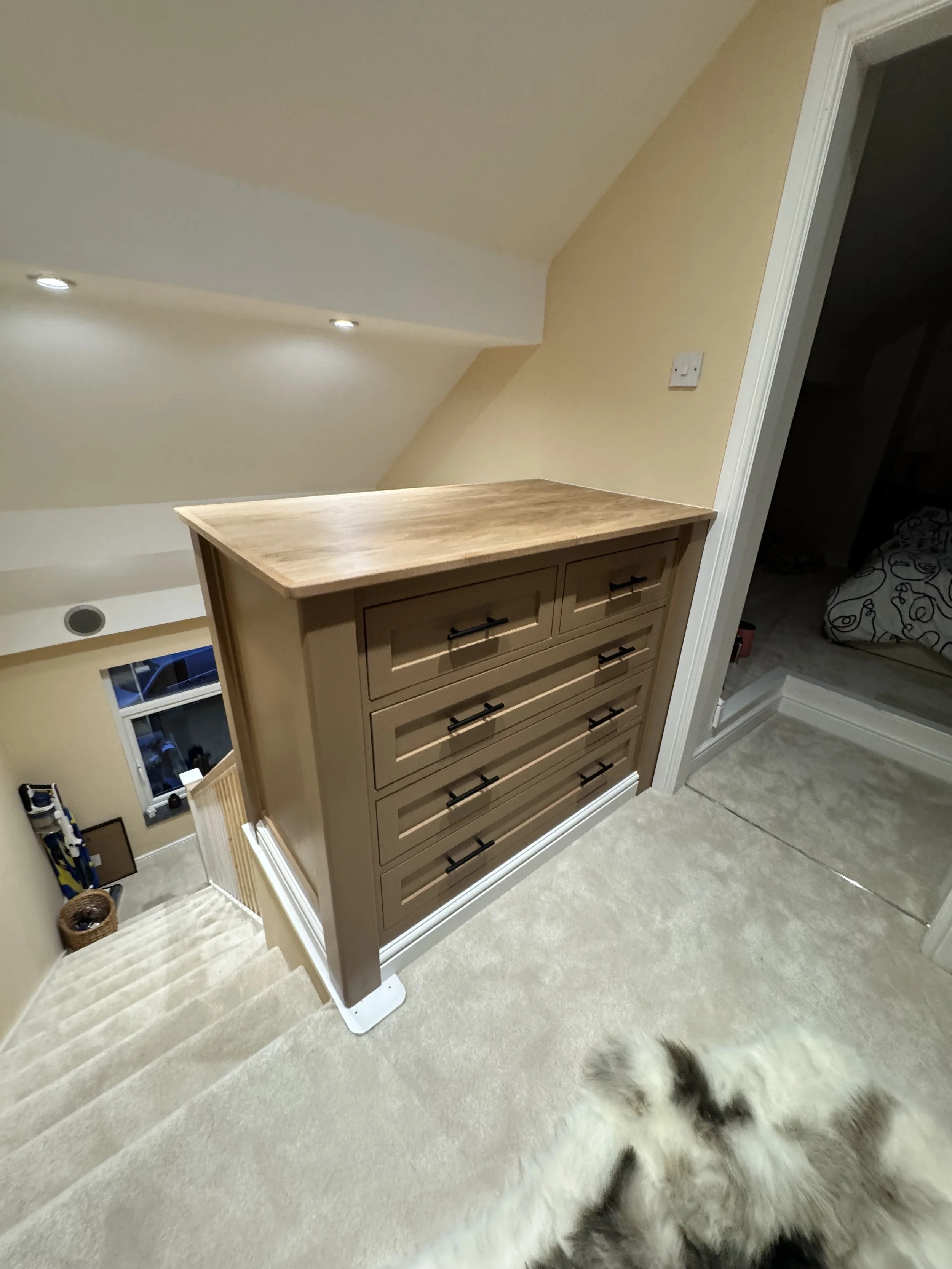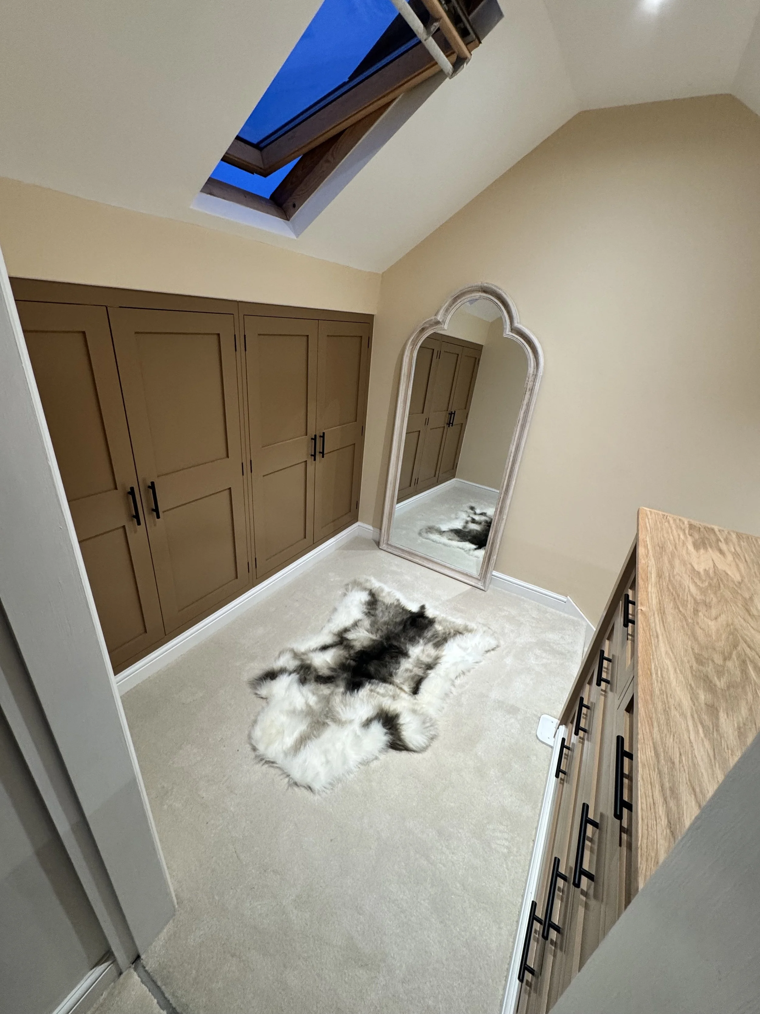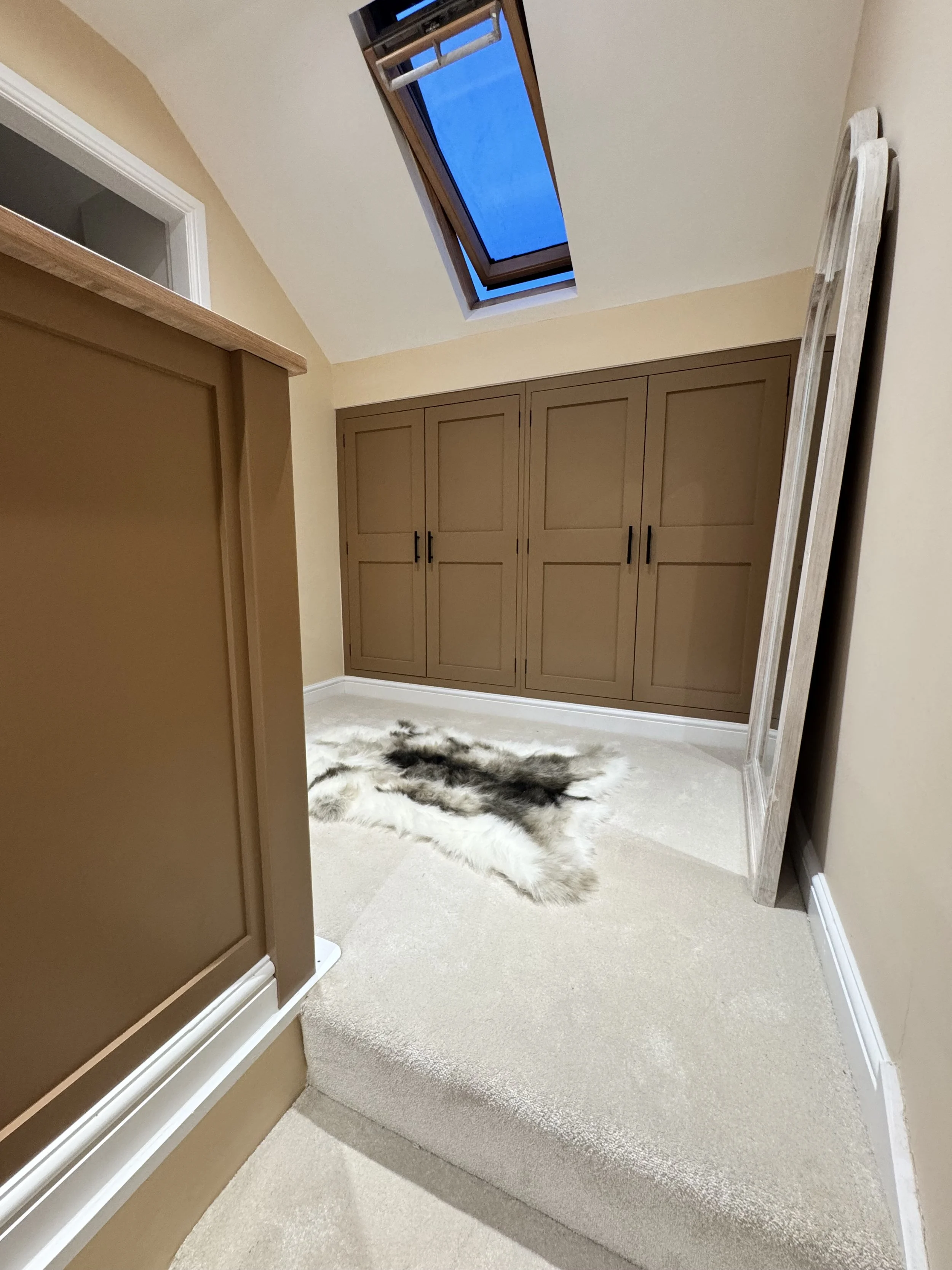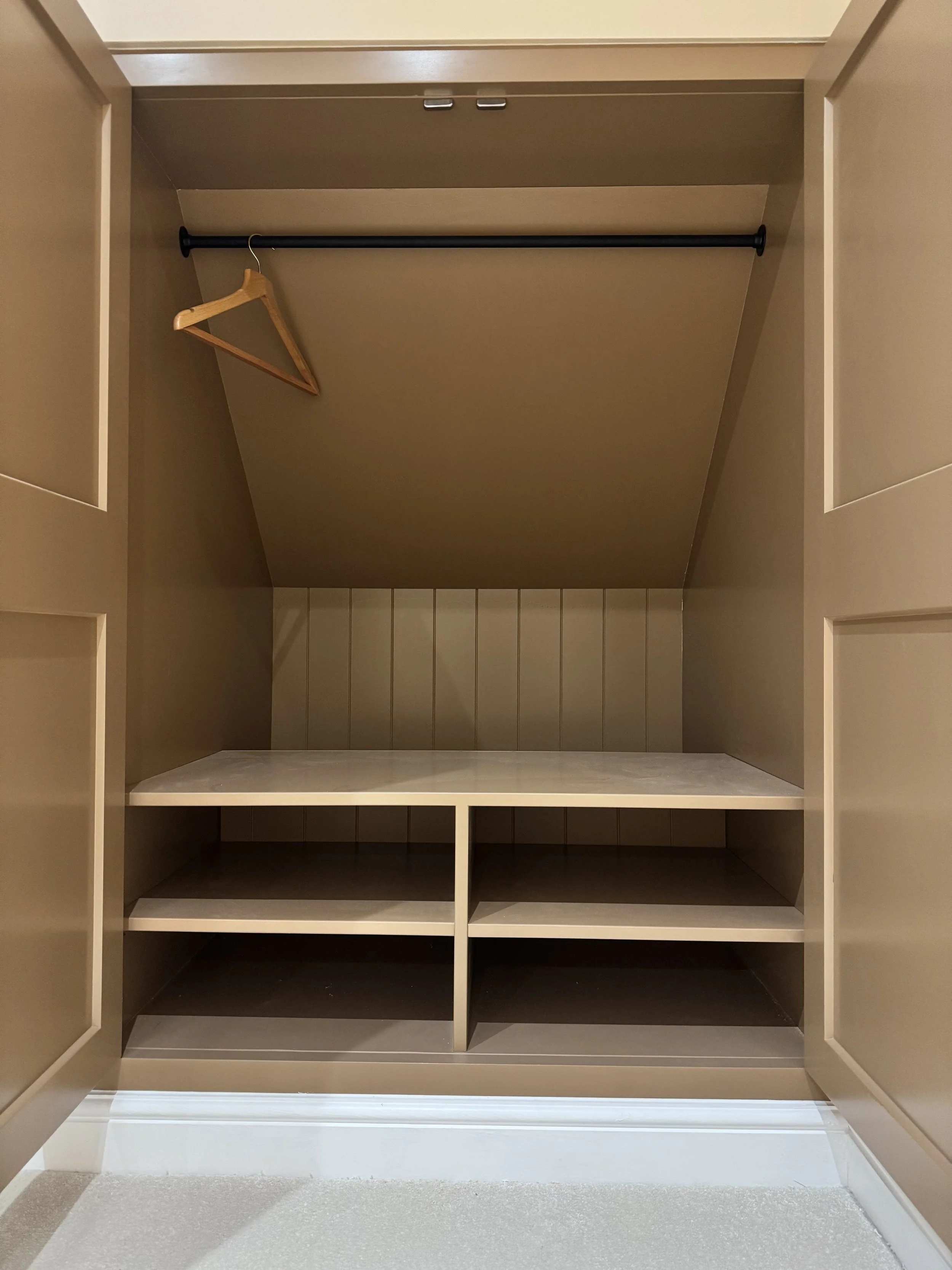 A clean run of classic shaker wardrobes, tailored to fit neatly beneath the sloped ceiling and maximise every inch of space. Finished in a warm, earthy tone with contrasting black ironmongery, they bring a subtle depth and character to the room while keeping things timeless.